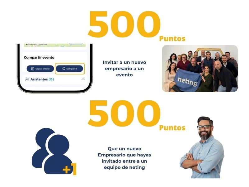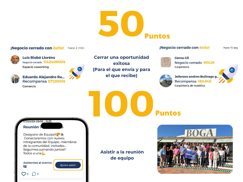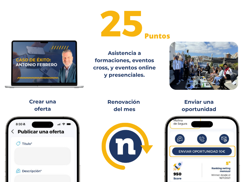 La gamificación sustituye mejorando al antiguo plan de afiliados. Antes solo «puntuabas» por invitar a un profesional a neting, ahora sumamos mas de 10 acciones que puntúan, y tendremos decenas de regalos por las que podrás canjear esos puntos.